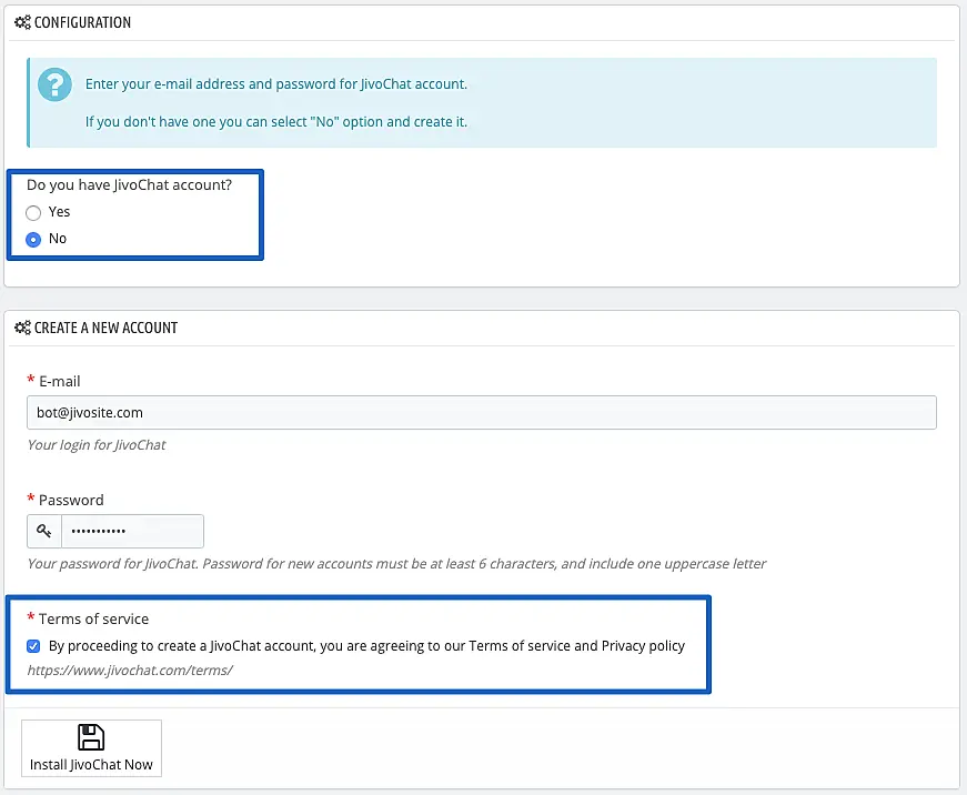 Next, open the JivoChat module configuration and connect your JivoChat account.
