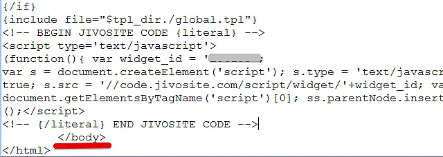 Open the footer.tpl file and paste the JivoChat code before the </body> tag.