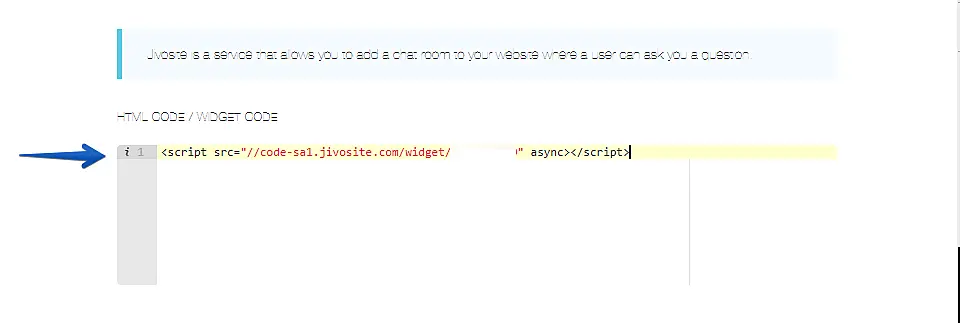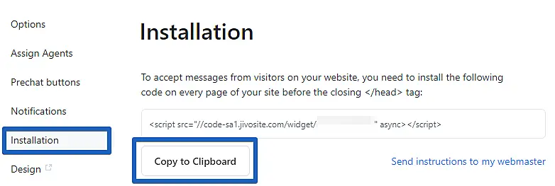 The code is in the JivoChat app -> Settings -> Channels -> Settings of the channel -> Installation. It must be copied to the clipboard.