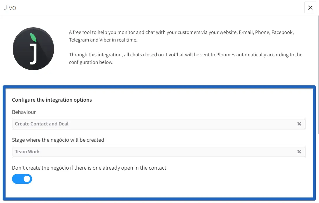 Ready! The integration is complete. Now, whenever a conversation is closed in JivoChat, the chosen behavior will manifest itself in Ploomes!