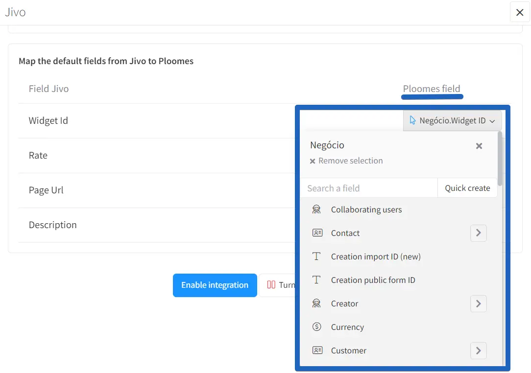 - You can also map standard JivoChat fields with Ploomes fields, as shown in the example below: