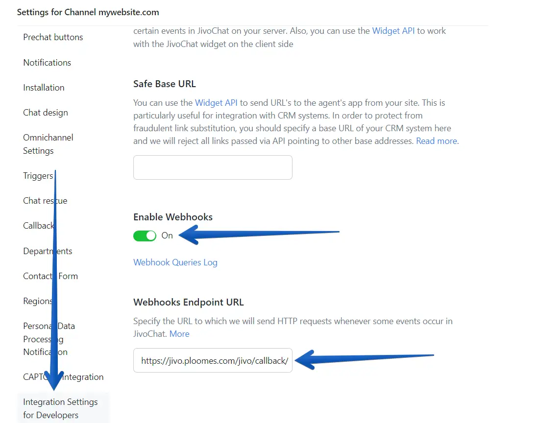 - In the menu on the left, click on "Integration Settings for Developers", turn on the "Enable Webhooks" option and paste the generated URL into the "URL for Webhooks" field.
