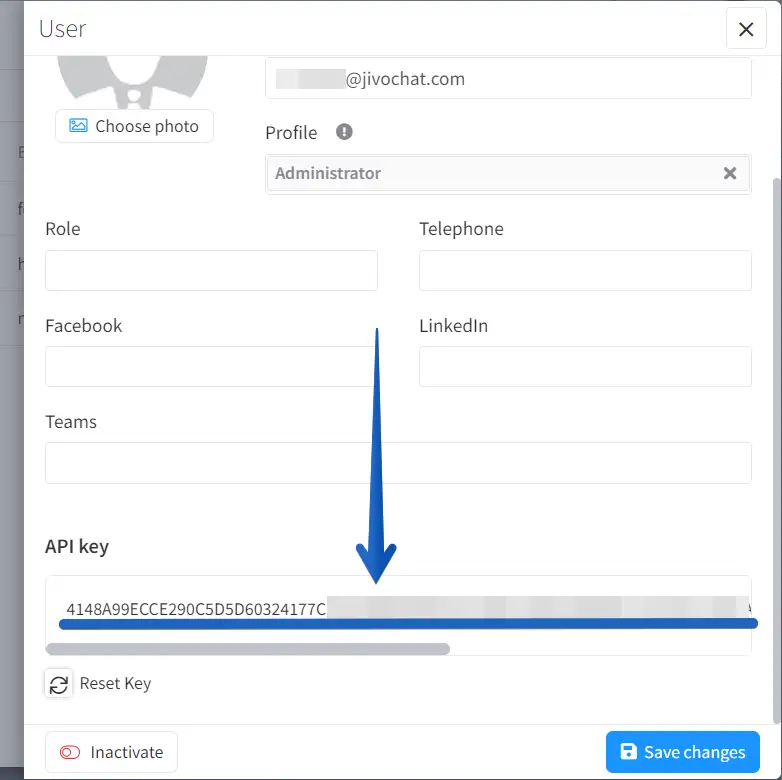 Copy the API key from the new user settings and paste it in the "Access token" field on your JivoChat app.