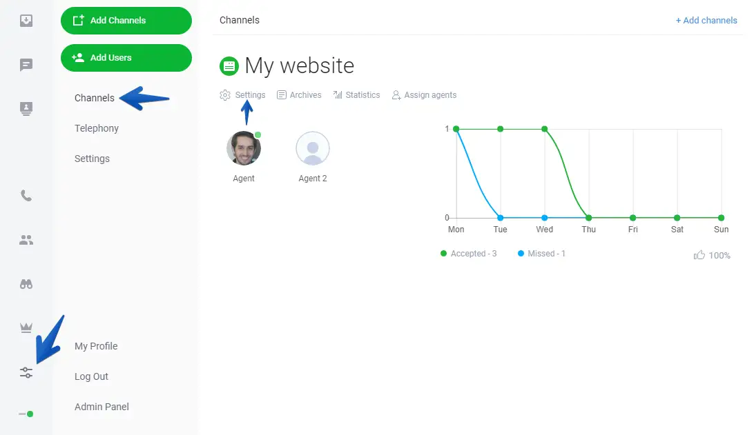 2.Click on the Manage button in the lower left corner, then go to Channels -> Settings (below your website name).