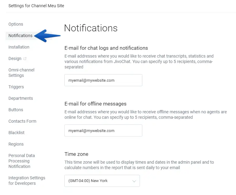 3.Next, move to the Notifications menu. Fill your Zendesk email in the fields E-mail for chat logs and notifications and E-mail for offline messages.