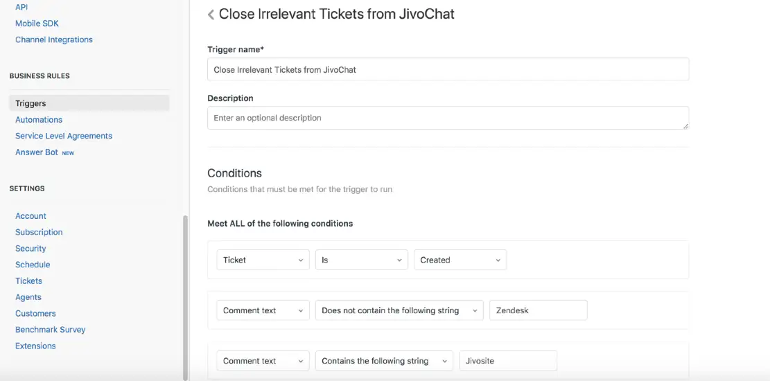 5.Now you need to create a trigger in Zendesk. Go to your Zendesk account and click on the Admin button. In the Business rules section, choose Triggers and create a new trigger with the following conditions: