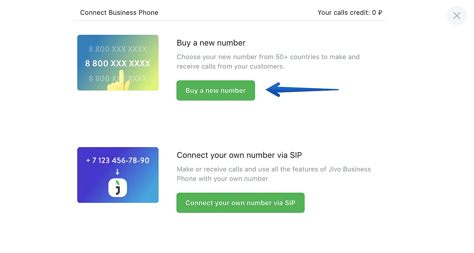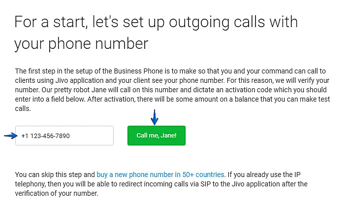 IMPORTANT: If you activate a regular phone number, you'll be able to make outgoing calls only. In order to receive calls using JivoChat, it is necessary to activate a SIP number of your own or purchase a phone number from JivoChat.