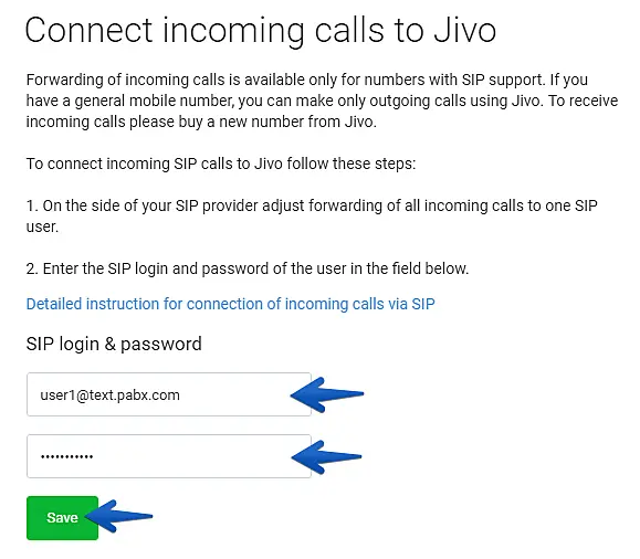 4. Insert your user's SIP credentials and click on "Save" to connect the incoming calls to JivoChat.