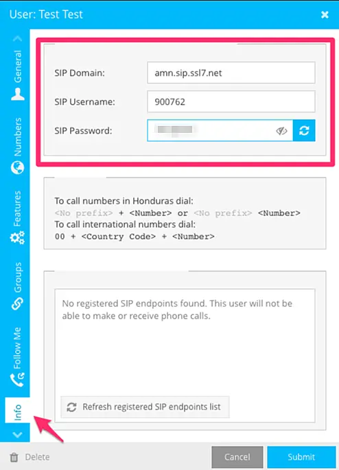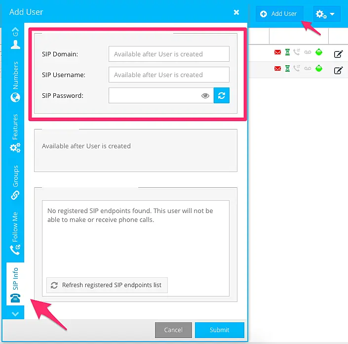 1. On your SIP provider panel, go the Users area and create a new user so that you have a SIP Domain, Username and Password for connecting to our service.