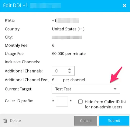2. Go to your SIP phone number settings and redirect all calls to the user you created, or to a pre-existing one in case you already had an existing user, by selecting the user as the "Current Target" of the phone number.