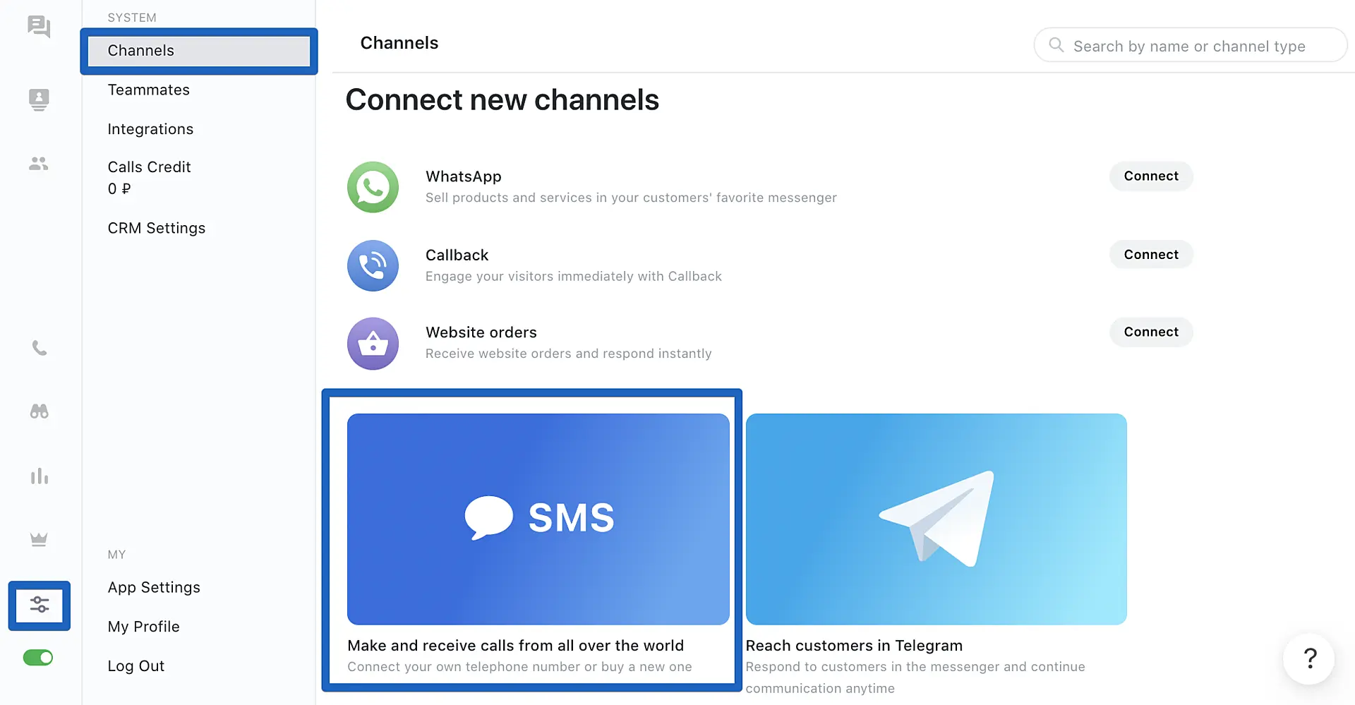 1. Open JivoChat app, go to «Manage» -> «Channels», find «Phone number» option and click "Connect".