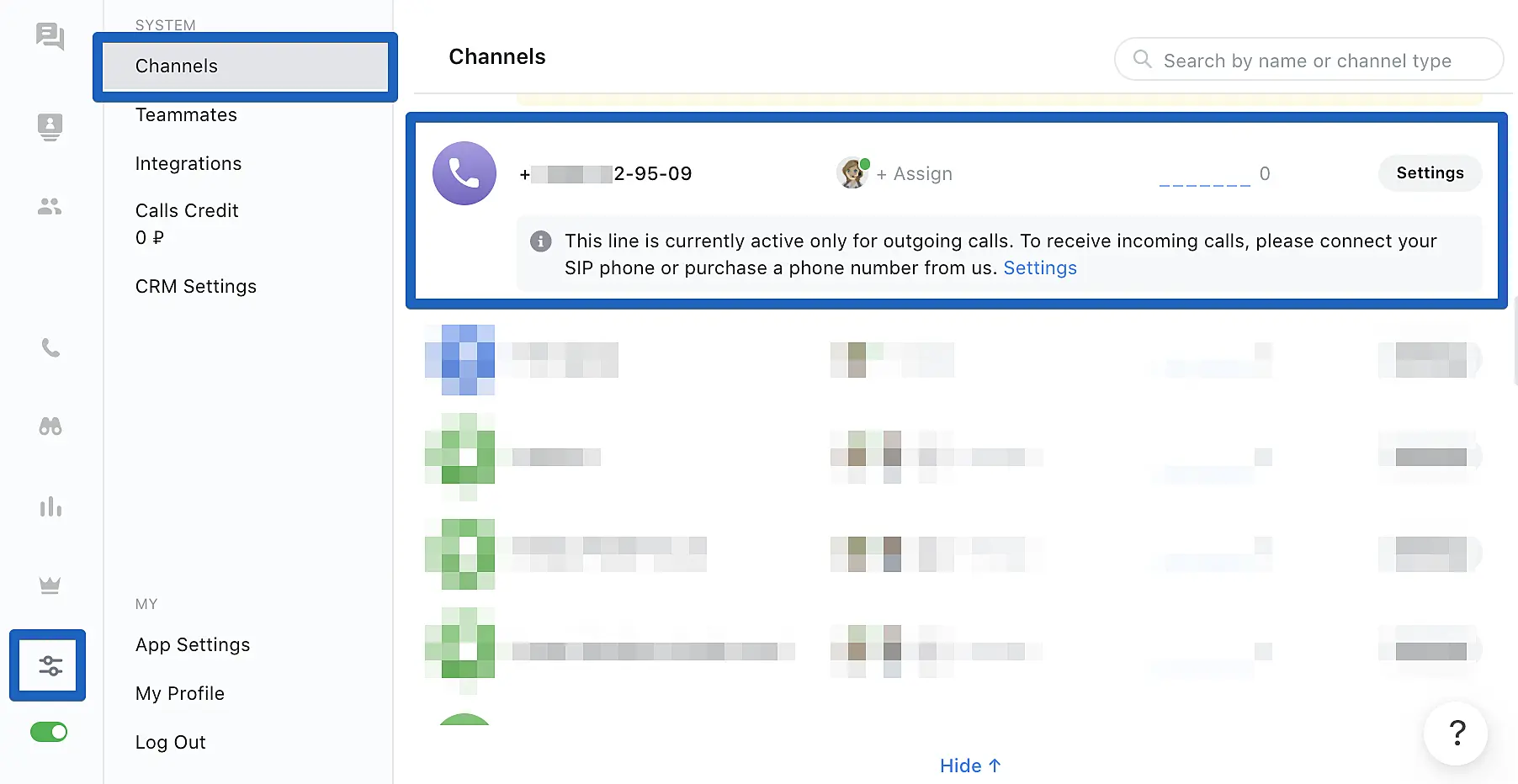 3. Access the phone number "settings" in JivoChat app in «Manage» -> «Channels»: