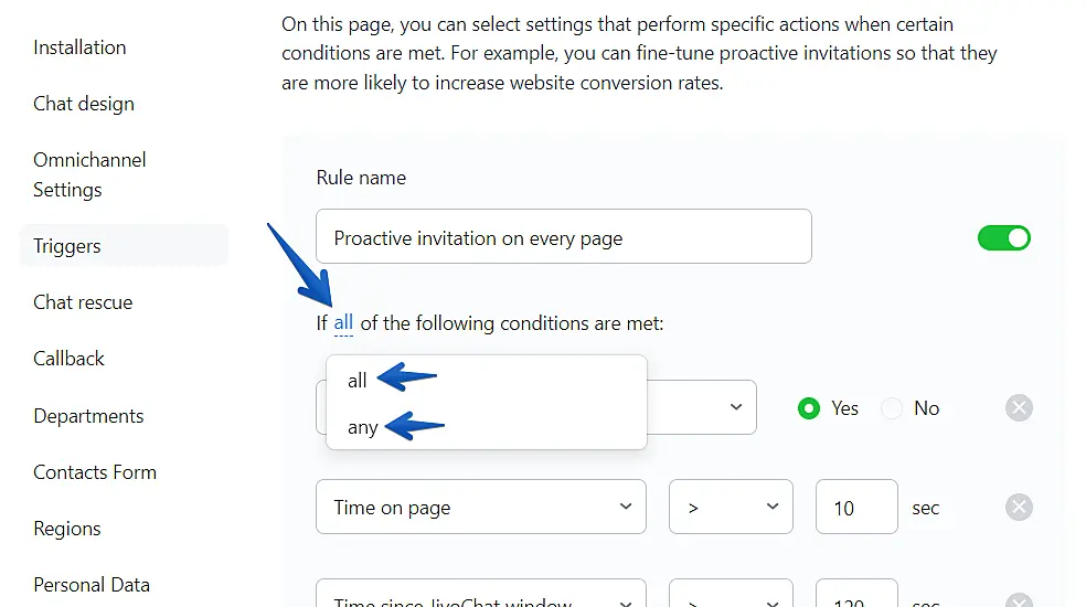 Time since the last proactive invitation – this condition helps you to protect your visitors from receiving unlimited triggers. If the visitor ignores the chat widget and goes to another page, the next trigger will work after "Time since the last proactive invitation" is expired.