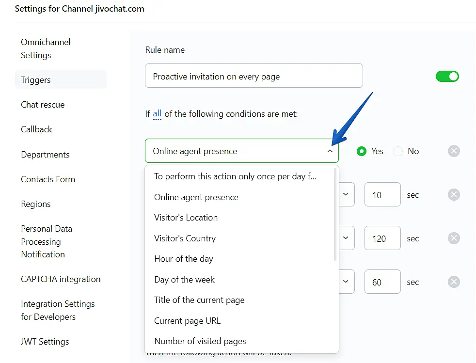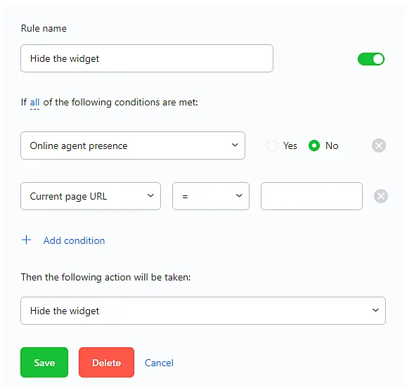 Online agent presence – this helps the system to understand what type of chat widget should be used. If you choose "NO", it will work for the offline-form, and if you choose "Yes" it will work for the online form. This condition is necessary for each trigger except for the "Hide the widget" action.
