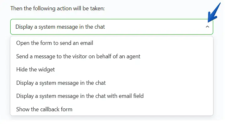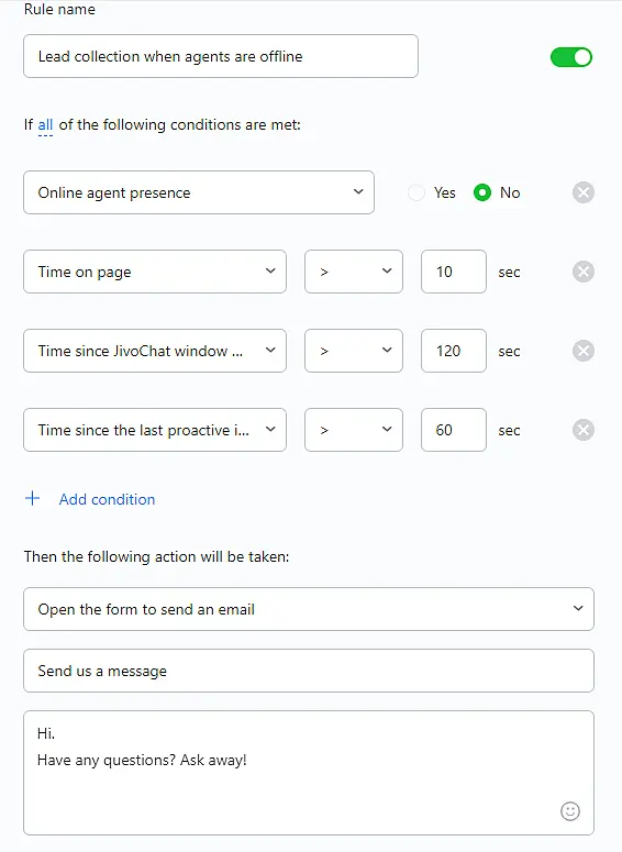 Open the form for sending an email – Automatically opens the JivoChat offline-form where the customer can leave his message. Condition "Presence of agents online: "No" is required.