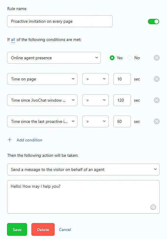 Send a message to the visitor on behalf of an agent - Automatically sends an invitation to chat from agent to customer. The condition "Presence of agents online: "Yes" is required.