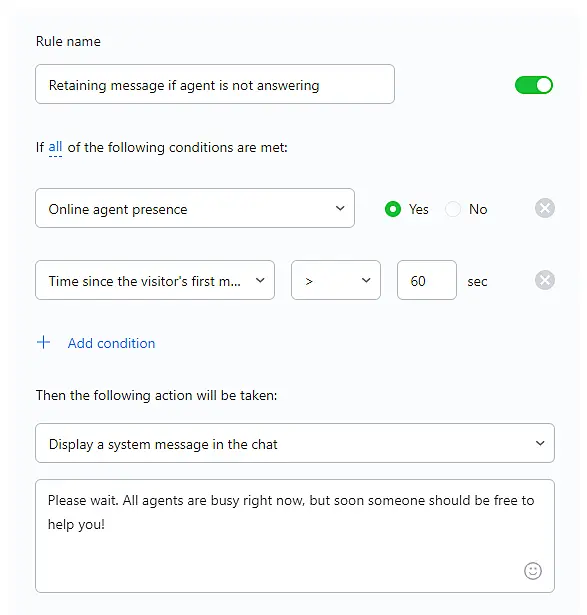 Display a system message in chat – If a customer sends a message in chat, and the agent doesn't respond to it for a specified time, this trigger will show a special message to the customer. The condition "Presence of agents online: "Yes" is required.