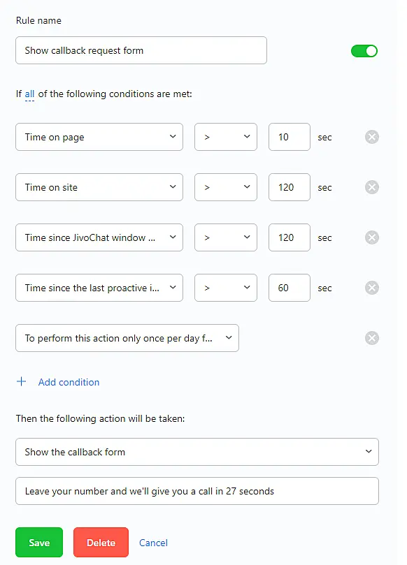 Show the callback form - Automatically opens the callback form of JivoChat where the customer can leave his number. The callback feature should be switch on.